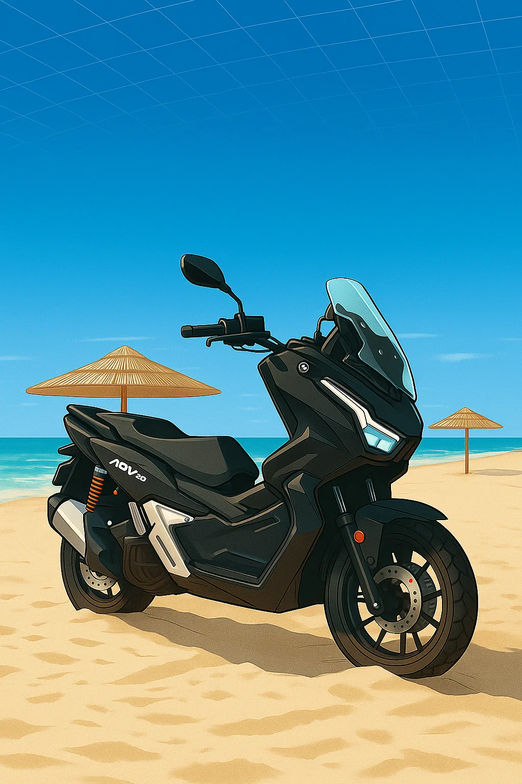 “ADV160 Morning Paradise” places a Honda ADV160 in a warm, serene beach scene under a cloudless cyan sky. The scooter’s matte-black bodywork and sculpted panels pop against golden sand, while the windshield picks up soft turquoise reflections from the sea. Straw parasols dot the shoreline and a faint retro grid in the sky adds a subtle synthwave wink without stealing the sunny, real-world vibe. Clean lighting, crisp edges, and a balanced three-quarter angle make this a cheerful, daybreak counterpart to the night series—perfect for a desktop or phone wallpaper that feels open, uplifting, and travel-ready.