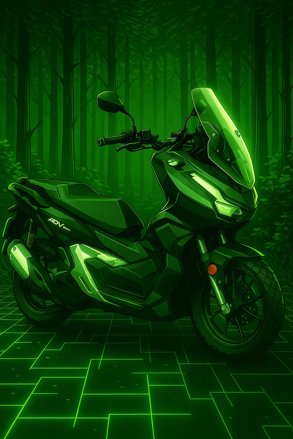 “ADV160 Digital Forest” places the Honda ADV160 in a moody woodland where nature meets circuitry. Emerald light traces the scooter’s sharp body lines—windshield, LEDs, and panels—while a luminous grid spreads across the ground like a holographic trail. Tall trunks fade into fog, giving the scene depth and a stealthy, tech-noir vibe. The contrast between organic silhouettes and geometric light makes the bike feel like a scout from the future—quiet, capable, and ready to explore.